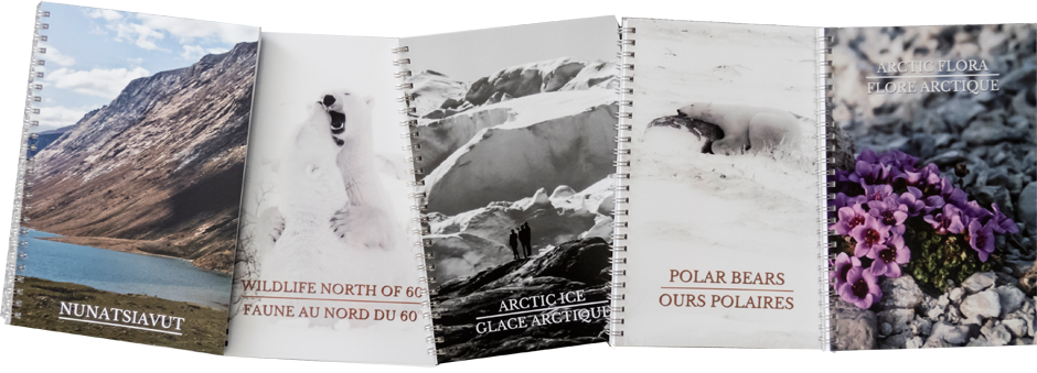 C'est également dans notre LIBRAIRIE que vous découvrirez notre collection de cinq carnets de note, chacun sur un thème différent relié à l'Arctique : flore arctique, glace arctique, ours polaires, faune au nord du 60e parallèle et le Nunatsiavut.